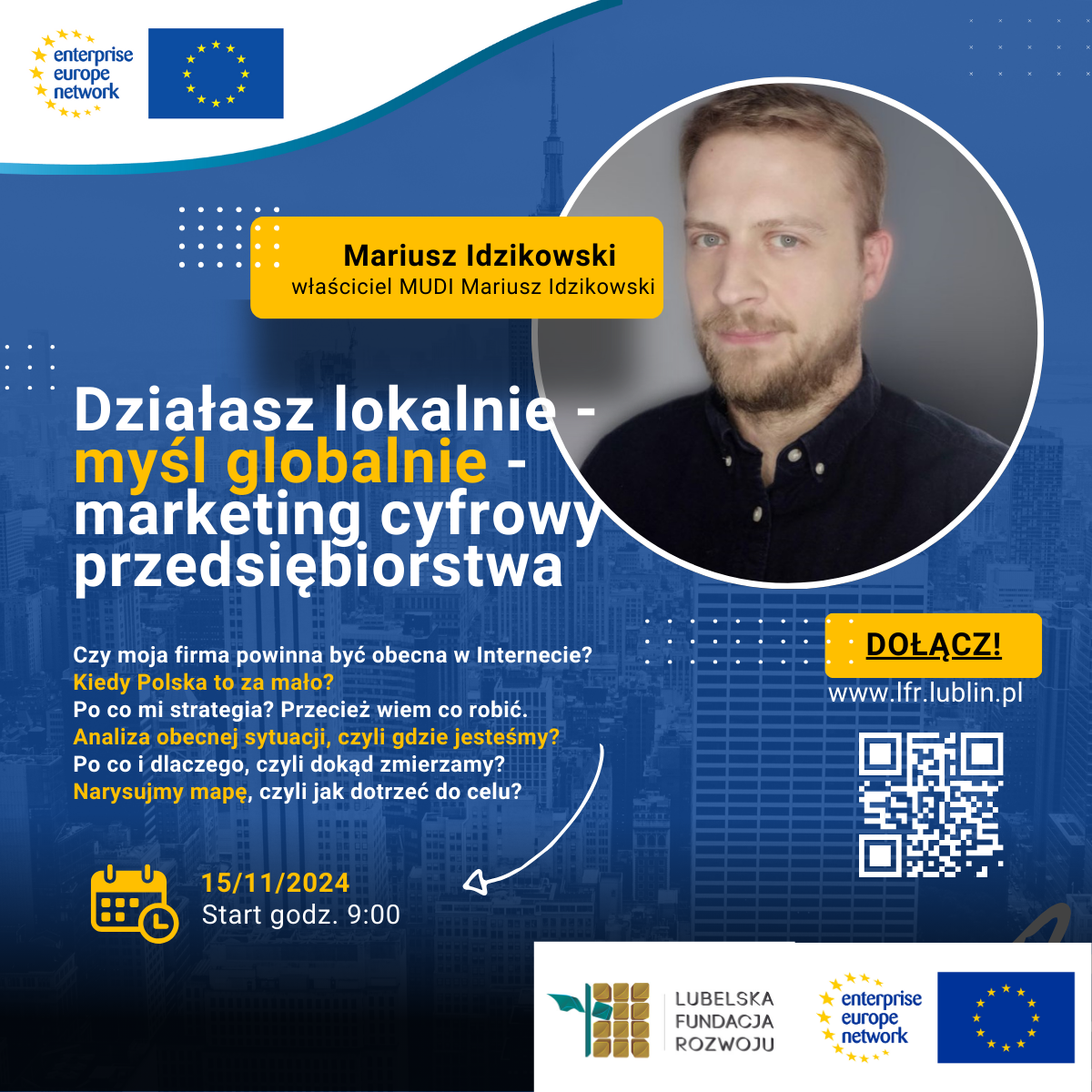 Ośrodek Enterprise Europe Network w Lubelskiej Fundacji Rozwoju zaprasza serdecznie do udziału w szkoleniu „Działasz lokalnie – myśl globalnie – marketing cyfrowy przedsiębiorstwa”, które odbędzie się 15 listopada 2024r. w siedzibie Lubelskiej Fundacji Rozwoju, przy ul. Rynek 7.