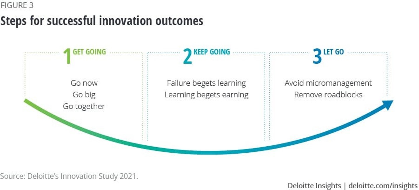 W jednym ze swoich raportów firma Deloitte przedstawiła prosty schemat pokazujący jak postępować aby wdrażanie innowacji przyniosło wymierne korzyści: