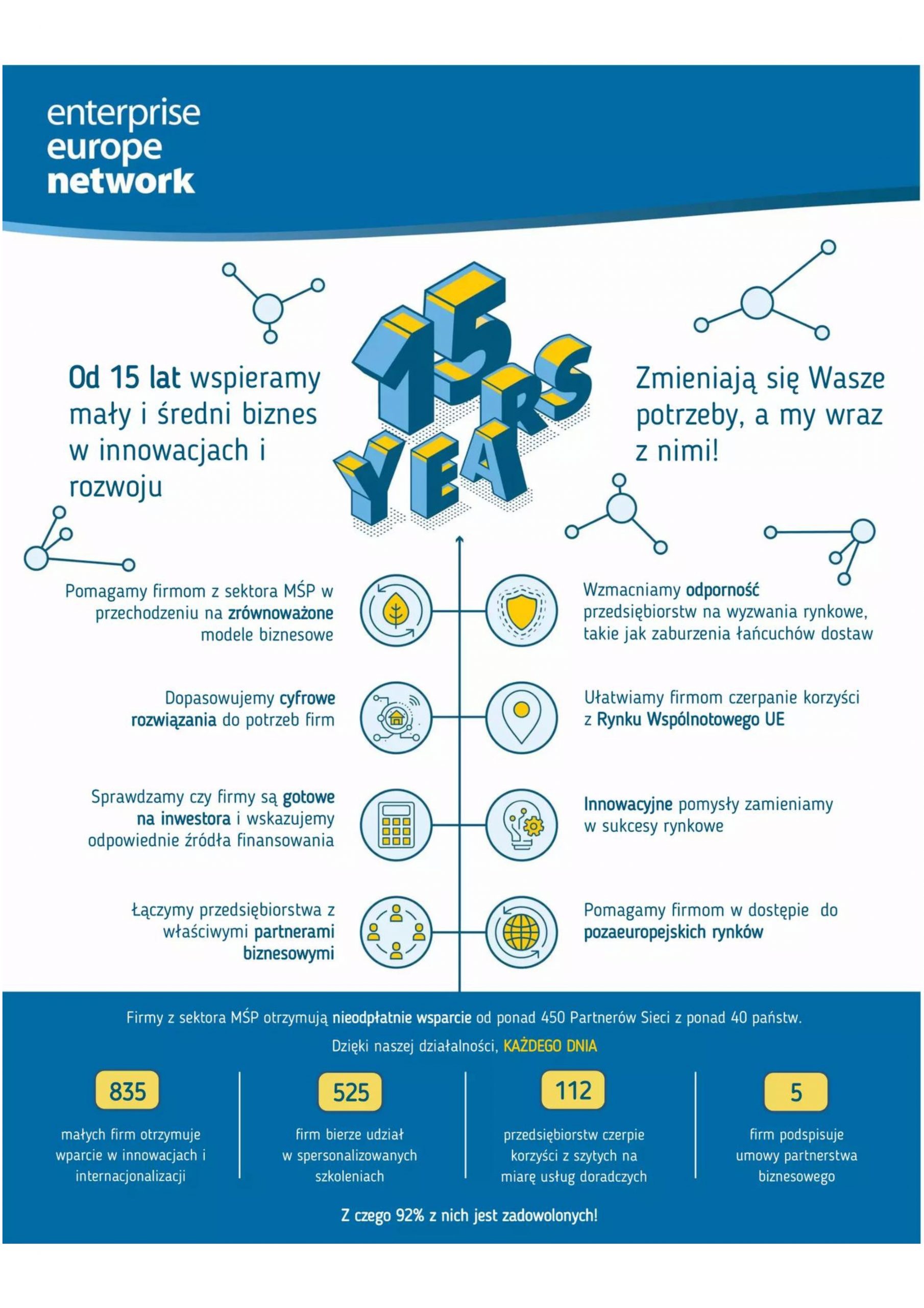 Sieć Enterprise Europe Network obchodzi w tym roku swoje piętnaste urodziny. 15 lat współpracy z firmami zaowocowało wsparciem ponad 4 milionów małych i średnich przedsiębiorców z kilkudziesięciu państw. Bezpłatną pomoc od Sieci otrzymało ponad 100 tysięcy polskich przedsiębiorców.